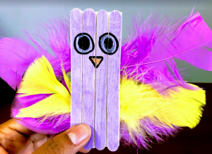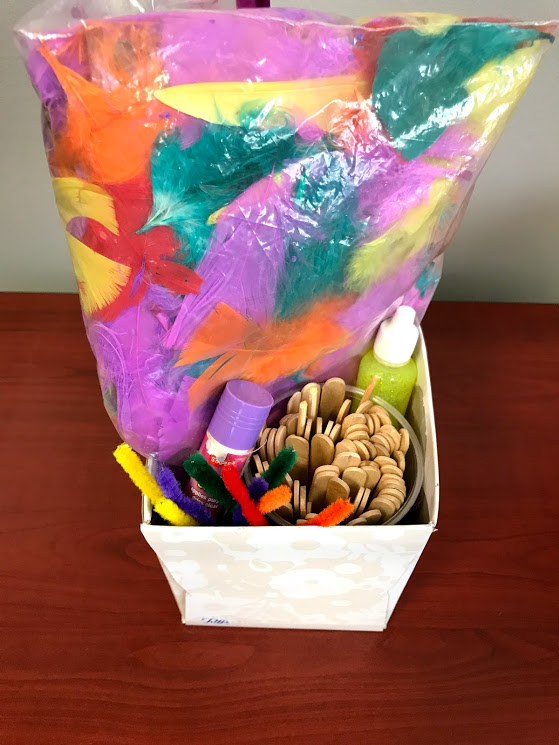 This craft box contains everything your child would need to make popsicle stick owls: popsicle sticks, blue, pipe cleaners, feathers, and markers (not pictured).